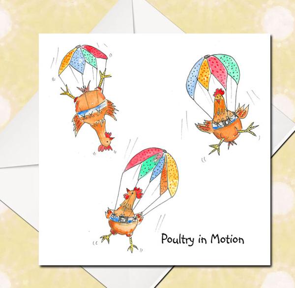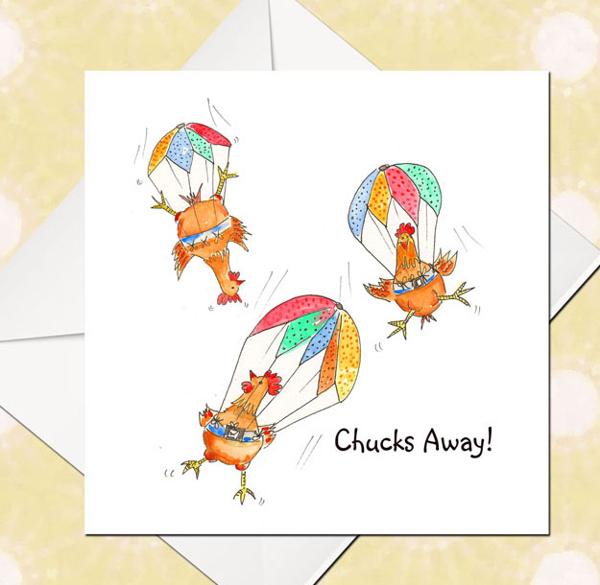 Three fabulous parachuting Chucks! Fun Greeting Card or Pun card.