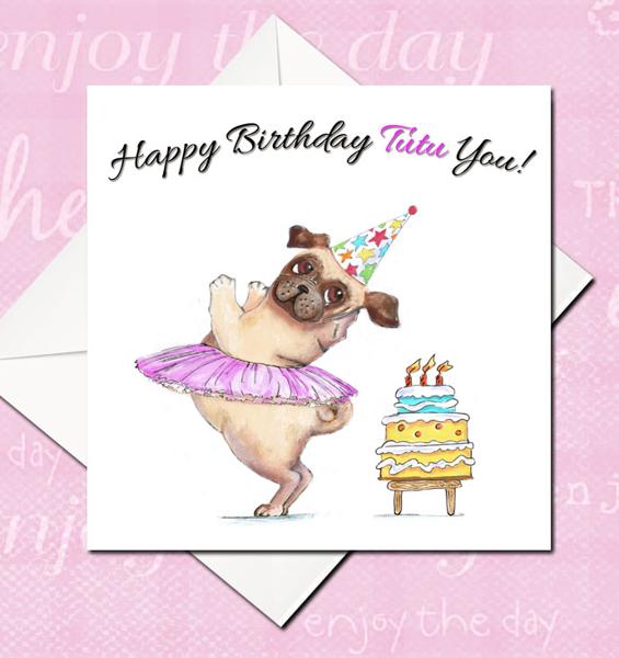 Cute little dancing Pug Birthday Card.