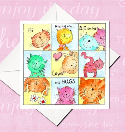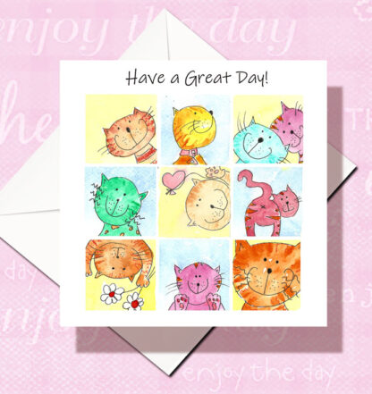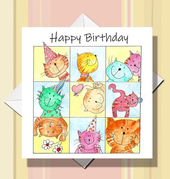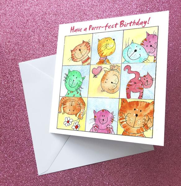Delightful and colourful selection of watercolour cartoon cats – send little messages of Love to someone special